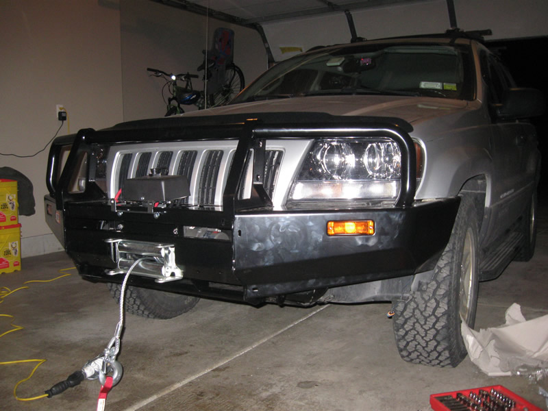 The installation took about 10 hours as several things ended up going wrong. I think it was a combination of incorrect drill bit size, and not reading the directions carefully. When I installed my bull bar on my Cherokee, the directions had you clock the M8000 winch to the bottom. So that is what I did, only to find out that on the WJ bar, they have you clock it to the top. So that took some time to pull the winch back out of the bar, reclock it, and remount it. And then there was a stripped bolt that had to be retapped. Overll, the installation didn’t go very smooth, but I think a lot of it was my fault.